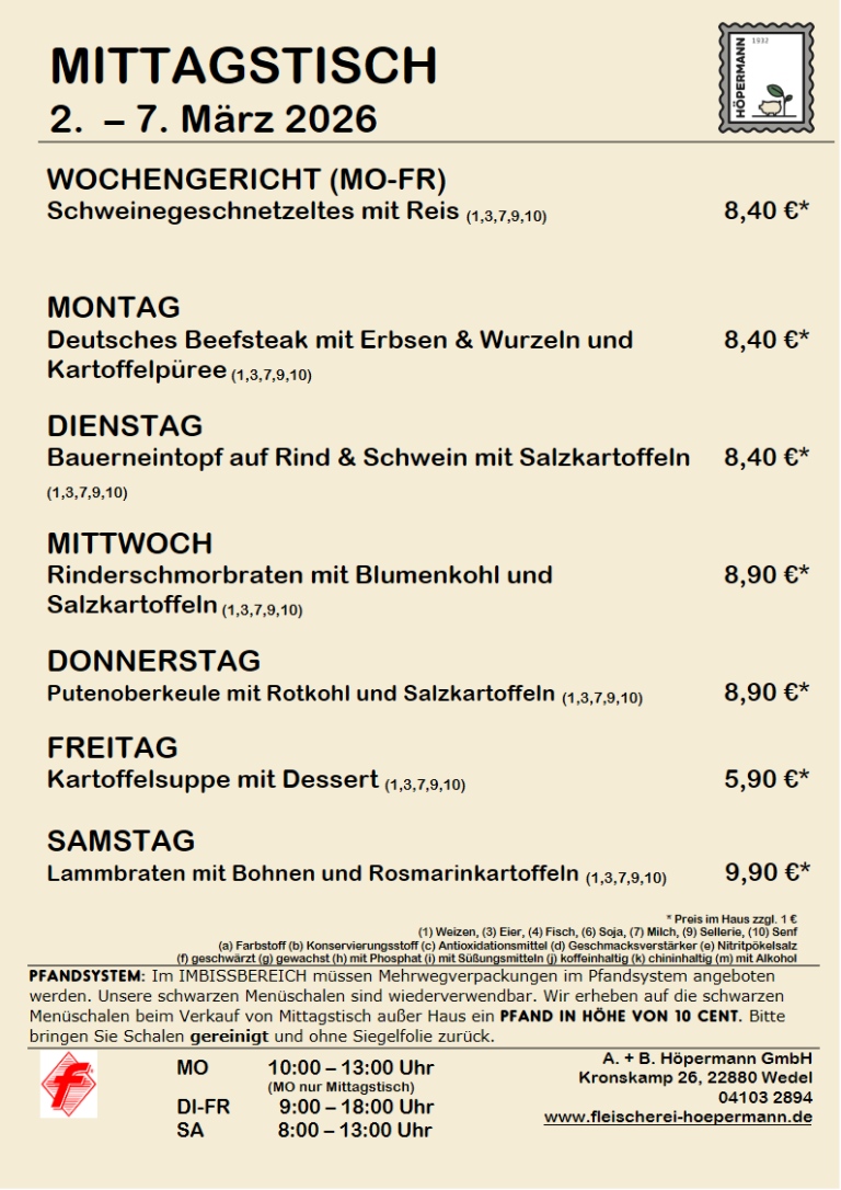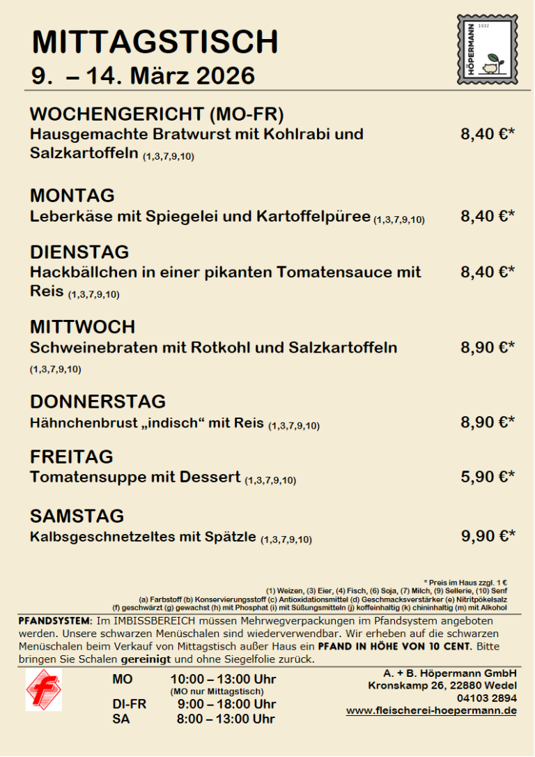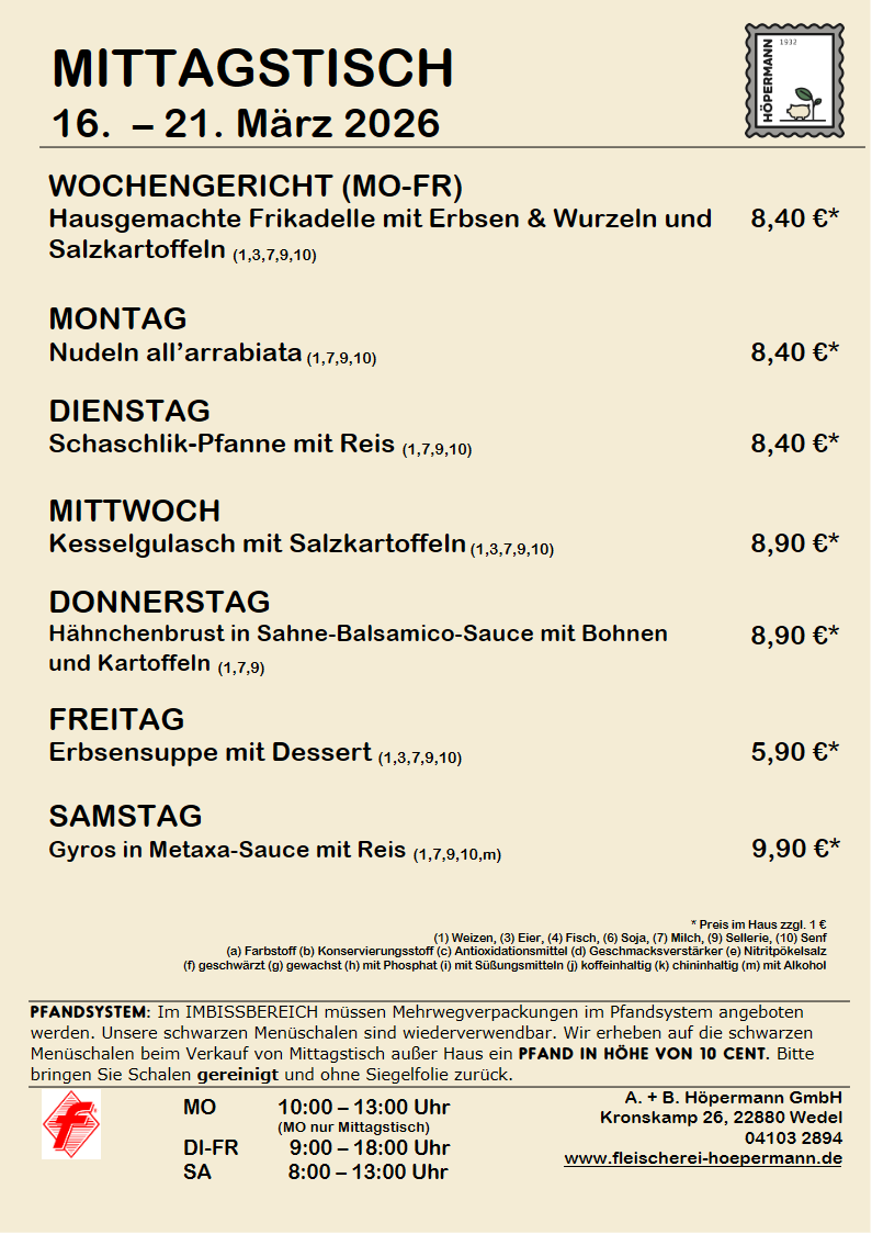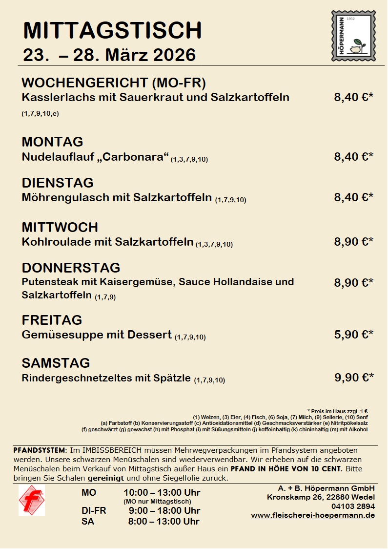 Im Imbissbereich müssen Mehrwegverpackungen im Pfandsystem angeboten werden. Unsere schwarzen Menüschalen sind wieder verwendbar. Wir erheben auf die schwarzen Menüschalen beim Verkauf von Mittagstisch außer Haus einen Pfand in Höhe von 10 Cent. Bitte bringen Sie Schalen gereinigt und ohne Siegelfolie zurück.